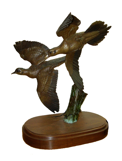 "Burning and Turning" by Ronnie Wells. Texas artist Ronnie Wells is an outdoorsman...he is an accomplished painter, a prize-winning sculptor, and author. He's also one of the nicest people in the art business. Here is one of his limited edition bronzes from over 20 years ago; a pair of pigeons on the wing, passing a barbed-wire fencepost. A very detailed piece that is professionaly cast and finished...smooth to the touch, with tasteful patina enhancements. This piece is in immaculate condition, is cast-signed by Wells, and is an Artist's Proof: 39. Wells is a true master who lives what he sculpts. Add this investment-grade bronze to your collection...only one in stock. (Requires additional shipping charges for insurance, weight and destination). |