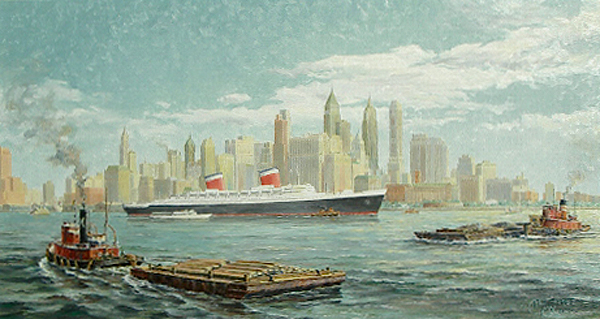 "New York (Study)" by Paul McGehee. The superliner S.S. "United States" passing the foot of Manhattan, bound for Europe in 1954. The area shown to the left would later be the site of the World Trade Center. This is the study painting for what later became the large original oil and print, now completely sold-out. |