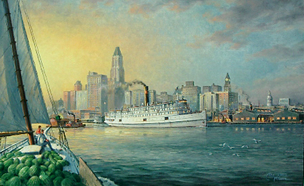 "Old Baltimore at Twilight (Study)" by Paul McGehee. The steamer "President Warfield" leaving Baltimore harbor for her run to Old Point Comfort and Norfolk, Virginia in 1934. This is the ship that later became the famous "Exodus" vessel, immortalized in history by her ill-fated attempt to ferry european jews to the shores of Palestine to help start the new state of Israel, in 1947. This is the study painting for the large original oil and later, print. |