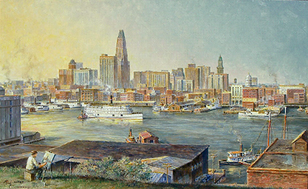 "Old Baltimore Harbor (Study)" by Paul McGehee. The steamer "City of Richmond" departs for points south from the famous Maryland port back in 1930. This is a splendid panorama of the city as viewed from the top of Federal Hill. This oil study painting served as the model for the later large original and subsequent print...notice the beard on the artist (a self-portrait) in this study...Paul had shaved it off by the time he painted the final original, and that's how it ended up in the print! |