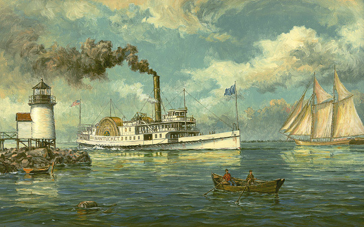 "Nantucket by Daylight" by Paul McGehee. The passenger steamer "Nantucket" passing Brant Point lighthouse in 1908. This miniature oil "study" painting served as a model for the final large "Nantucket" painting from which the famous print was made (note the different lighting and sky used in this study painting). |
