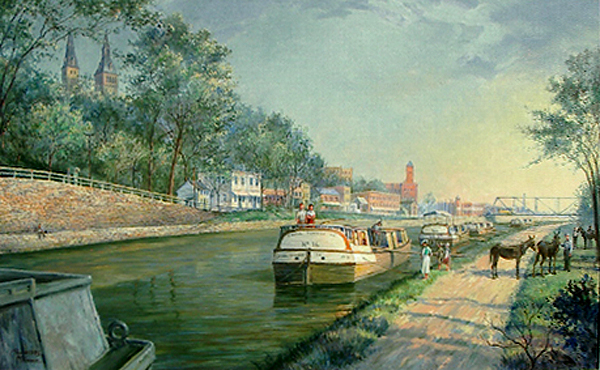 "Old C & O Canal (Study)" by Paul McGehee. A bucolic glimpse through a window to the past of a scene along the canal at Georgetown, near Washington, D.C. at the turn of the last century. This was the oil study painting for what later became the large original, from which the famous print was made. |