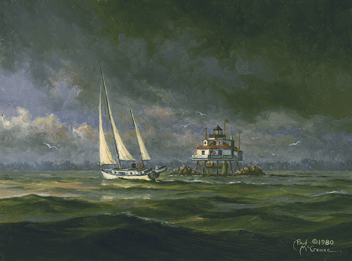 "Passing Thomas Point" by Paul McGehee. One of the most striking sights on Maryland's Chesapeake Bay is Thomas Point Lighthouse, now over a century old. Still serving as a beacon to passing ships, she is one of the last remaining screw-pile type lighthouses in the United States, and one of the very few still in use. For most of her career, she was manned, with the keeper and keeper's family living within. Located near Annapolis and maintained by the United States Coast Guard, Thomas Point Lighthouse is today a cherished landmark to yachtsmen and merchant seamen alike. |