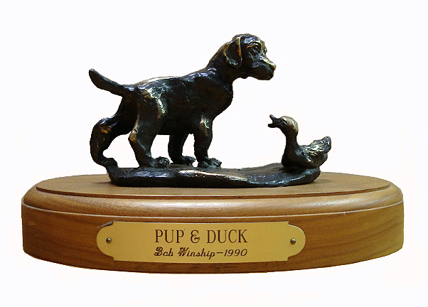 "Pup and Duck" by Bob Winship. Legendary sculptor Bob Winship lives in Minnesota and specializes in hunting subjects including game birds and dogs...he is well represented in collections worldwide and has numerous awards and public installations under his belt. This is a whimsical scene (with the two aforementioned creatures checking each other out) from 1990. In perfect condition, hard to find, stunningly mounted on a wooden base...this would be a great "starter" piece for a bronze collection! Add this investment-grade bronze (at a great price) to your collection. Only two in stock. (Requires additional shipping charges for insurance, weight and destination). |