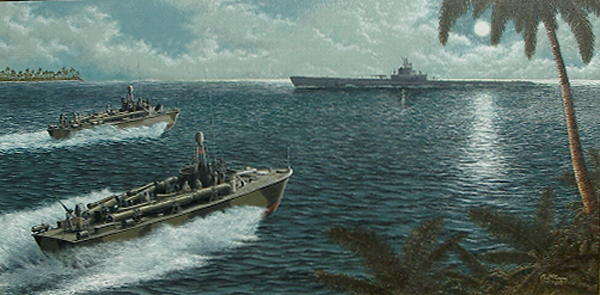 "South Pacific Rendezvous" by Paul McGehee. In the Pacific theatre of World War II, one of the most effective weapons against the Japanese was the PT boat (patrol boat). Also known as "mosquito boats", these small craft could manage the treacherously winding inlets of the tropical islands as no other could, striking swiftly with their torpedos and guns, then disappearing back into the murky jungle waters. This 1943 scene depicts a night rendezvous with an American submarine...with coordinates radioed in advance, this would be a way of transfering personnel or supplies under the cover of darkness. It took a special kind of bravery to be a part of a PT boat crew...remember the famous incident of PT 109 and future President John F. Kennedy? Casulties were high for those that manned these wooden boats, but the damage inflicted on the Japanese war machine by the PT boat patrols was huge. Those called to duty during the perilous years of the second World War were truly our "finest generation". All gave some...but some gave all.