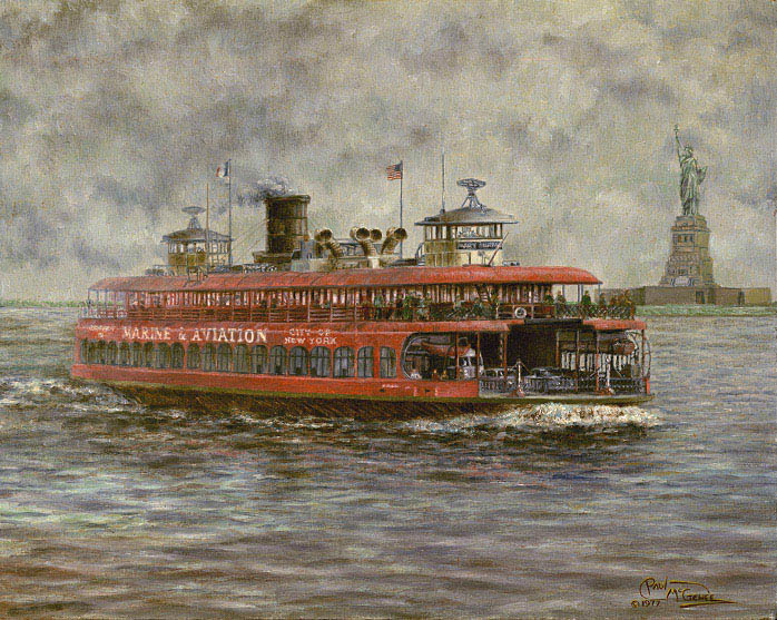 "The Staten Island Ferry" by Paul McGehee. The "Mary Murray" was launched in 1937 and had a long career on the route between New York City to Staten Island, New York carrying passengers and automobiles back and forth. "Mary Murray" is shown here in 1952 on a grey day's run from Staten Island back to Manhattan, steaming past the Statue of Liberty.